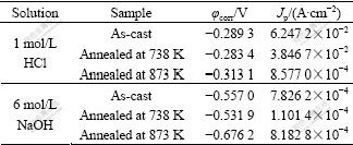 The corrosion rates of as-cast and annealed samples in 6 mol/L NaOH solution at 298 K are shown in Fig.3. It is found that the partially crystallized sample shows superior corrosion resistance in this alkaline solution. Especially, the corrosion rate of partially crystallized samples is almost half that of the as-cast samples, while the fully crystallized sample exhibits the worst corrosion resistance.