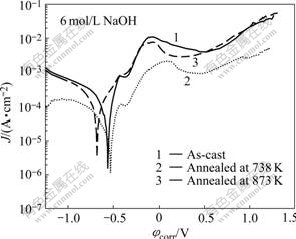Fig.5 Potentiodynamic polarization curves of as-cast and annealed samples in 6 mol/L NaOH solutions at 298 K open to air