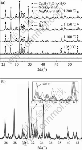 图3 含9%生物玻璃多孔生物陶瓷在不同烧结温度下的XRD谱