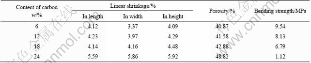Table 2 Effect of content of carbon on linear shrinkage, porosity and bending strength of samples(1 150 ℃, 9% BG)