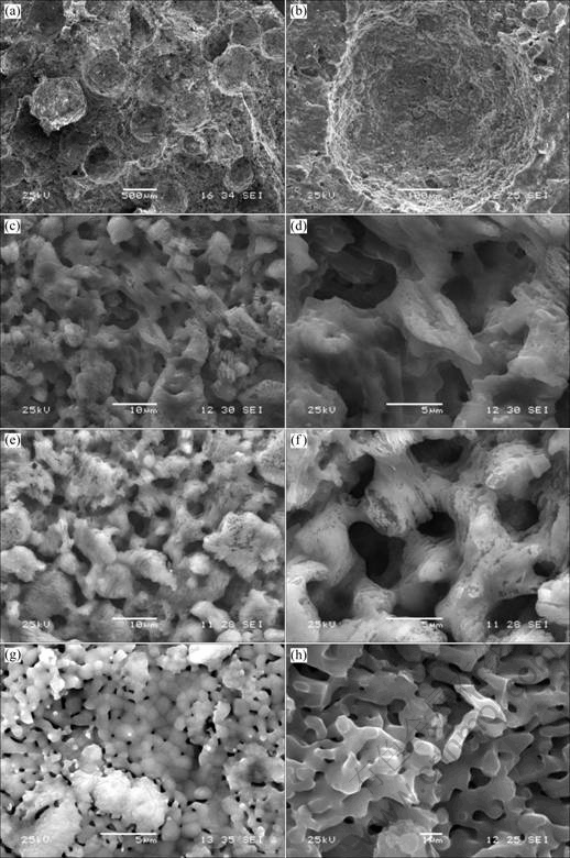 Fig.4 SEM images of HA scaffold: (a), (b) Morphologies of macropores; (c), (d), (e), (f), (g), (h) Morphologies of micropores