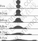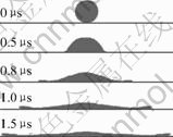 Fig.1 shows the 2D images of the flattening process of a 50 μm diameter molten aluminum droplet on the smooth substrate. The droplet with a velocity of 100 m/s falls onto the substrate. Due to the sudden deceleration, the droplet flattens and the high-pressure inside forces the melted droplet to spread out laterally into a disk-like shape, and the splat height decreases with the increase of spreading time. It is obvious that the liquid splat is symmetric around the droplet axis. Spreading and recoiling are the basic features of any droplet impact[15]. The kinetic energy provides the driving force of spreading, while the viscosity dissipation and surface tension of the flow are the resisting force, which may result in the phenomena of recoiling. With the diminishing of the droplet inertia, the surface tension pulls back the liquid to the center of the droplet and hence the splat rim recoils. Thereby, it can be clearly observed that the splat periphery is not the thinnest part, especially at the end of the flattening. In addition, it is noticed that there is an obvious warp between the spat rim and the substrate when the fluid is flowing. This is because the rim of flowing liquid spreads the most rapidly and the atmosphere around is then forced to push out, which results in the pressure forming between the front and the substrate. It can be deduced that when the liquid flows so fast that the gas does not escape absolutely from the gap between the liquid and substrate, the pore is formed, which would have a strong effect on the coating microstructure and properties.