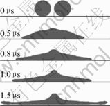 Fig.4 shows the interaction between the two aluminum droplets with a diameter of 30 μm in the vertical direction. The upper droplet with the velocity of 50 m/s impacts on the lower one with the velocity of 100 m/s. It can be seen that the upper droplet lands on the flattening lower one, and then they join together and spread out radically into a disk-like shape. The final shape is quite alike with the single droplet impact.