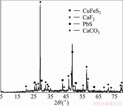 The mineral sample used in the experiments contained chalcopyrite (CuFeS2) as the main mineral phase, and galena (PbS), calcite (CaCO3) and calcium fluoride (CaF2) as the minor phases, according to the X-ray diffraction characterization (Fig. 1). Chemical analysis showed that the mineral sample contained 34.63% Cu, 25.35% Fe and 30.45% S. The mineral was ground to fine powder and then passed through a sieve with a pore size of 0.075 mm.