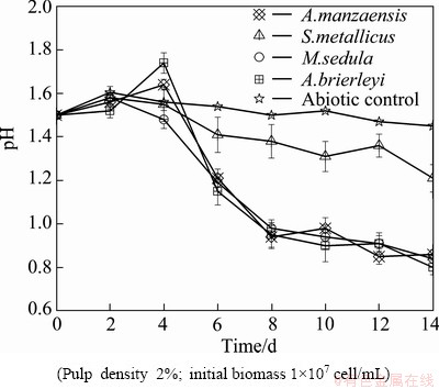 Fig. 3 Comparison of evolution of pH value of A. brierleyi, M. sedula, A. manzaensis and S. metallicus in bioleaching chalcopyrite at initial pH=1.5 and 65 °C