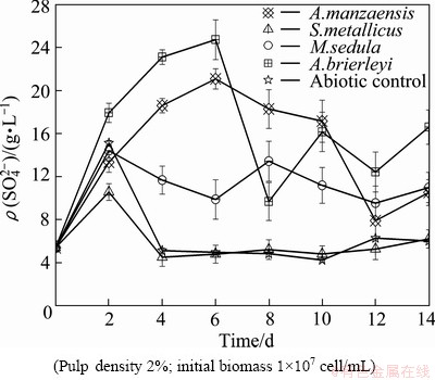 Fig. 4 Comparison of evolution of sulfate ion concentration of A. brierleyi, M. sedula, A. manzaensis and S. metallicus in bioleaching chalcopyrite at initial pH=1.5 and 65 °C