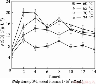 Fig. 6 Comparison of evolution of sulfate ion concentration of mixed thermophilic archaea in bioleaching chalcopyrite at various temperatures and an initial pH of 1.5