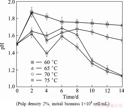 Fig. 7 Comparison of evolution of pH value of mixed thermophilic archaea in bioleaching chalcopyrite at various temperatures and an initial pH of 1.5