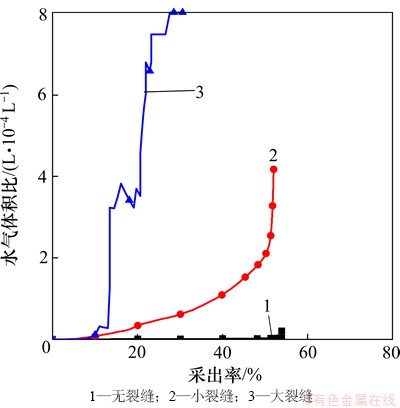 不同裂缝模型对气井生产的影响模拟结果分别如图4和图5所示。由图4可见:在相同采收率下,裂缝渗透率大的模型,对应的水气比高,气藏最终采收率低。由图5可见:随着生产的进行,裂缝大的模型对应的累积产气量远远小于小裂缝、无裂缝模型的累积产气量。这说明随着裂缝增大,储层渗流系统更加畅通,流体的导流能力随之提高,底水的活动也相应增强,气井的水侵速度随之加快,气井无水生产和稳产期随之缩短,导致最终采收率降低。因此,裂缝渗透率对气井生产影响很大。
