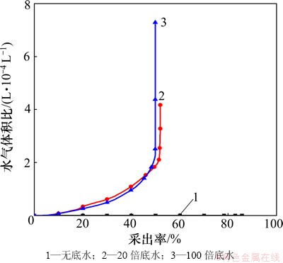 不同底水大小对气井生产的影响模拟结果分别如图6和图7所示。由图6可见:有无底水对气藏采收率影响很大,无底水气藏采收率很高,有水体气藏采收率较低,而底水大小超过一定程度,底水大小影响幅度不大(也就是20倍底水与100倍无限大底水生产差别不大)。由图7可见:随着气藏水体的增大,在单井配产产能不变的情况下,模拟前期气井累积产量趋于一致;随着生产进行,气藏水体越大,底水能量越充足,气井产水上升相对较快,水气比较高,累积产气量逐渐变缓,导致最终采收率降低。