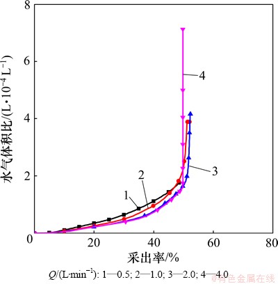 Fig.10 Relation between water-gas volume ratio and gas recovery factor for different gas productions