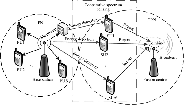 Cooperative spectrum sensing is proposed to improve the SU’s detection performance when the PU isshadowed or in severe multipath fading. As shown in Fig. 1, a PN including D PUs and one base station is considered, and a CRN consisting of N SUs that act as the sensing relays to cooperatively detect the PU’s state (presence/absence) and one fusion center that acts as a base station to manage these SUs and process sensing information. The SU1’s detection performance is inaccurate because of the shadowed PU, but with the aids of SU2-SUN, SU1 can make an accurate decision through sharing the sensing information from other SUs. In cooperative spectrum sensing, each SU detects the PU’s transmission signal by energy detection independently and then reports its local detection result to the fusion center [14]. The fusion center will make a final decision on the PU’s state through combining all the received detection results and then broadcast its decision to all the SUs.