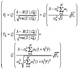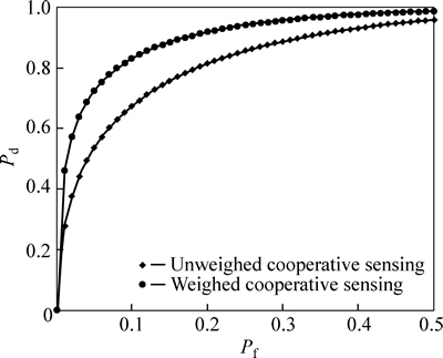In the fusion center, comparing Z to a specific threshold λ, Ω0 is decided with Z<λ while Ω1 is determined with Z≥λ. Noting the false alarm probability Pf and the detection probability Pd of the weighed cooperative spectrum sensing are given as follows: