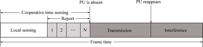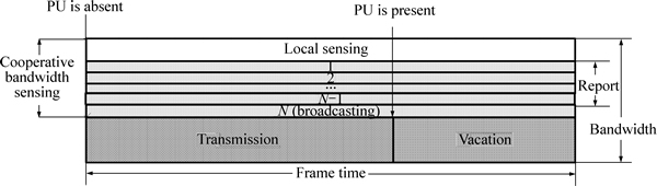 It is supposed that multiple SUs transmit data through time division multiple access (TDMA), and there is only one SU to communicate in one frame. In the traditional cooperative time spectrum sensing from Refs. [11-13], before transmission, cooperative spectrum sensing is firstly performed by multiple SUs at the beginning of a frame, wherein each SU’s local sensing result is reported to the fusion center in a single time slot in order to avoid transmission conflict, as shown in Fig. 4. If the PU’s absence is decided by the fusion center, the SU can transmit data in the PU’s channel, however, if the PU’s presence is determined, the SU has to shift to another idle channel [19].