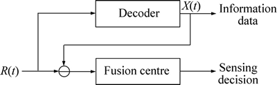 At the beginning of the bandwidth spectrum sensing, an initial cooperative spectrum sensing is performed to determine the absence or presence of the PU by the fusion center. If one channel is detected to be idle, the SU is allowed to access this channel to transmit data during a frame. To determine the action of the PU at the current time, the communicating SU’s receiver decodes the data signal X(t) from the transmitter, and the fusion center strips X(t) away from R(t) to obtain the remaining sensing signals zi(t) for i=1, …, N-1, which are then combined to get a final decision in real time, as shown in Fig. 6.