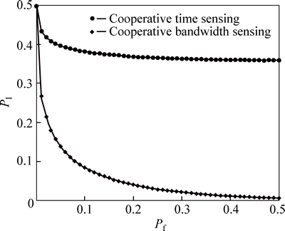 Figure 7 indicates the detection probability Pd by the unweighed and weighed cooperative sensing methods, with various false alarm probabilities Pf. As can be seen from Fig. 7, Pd improves as Pf increases, because Pd and Pf have the same monotony in λ; Pd of weighed cooperative sensing is larger than that of unweighed cooperative sensing, which demonstrates the predominance of our proposed method. Figure 8 shows the interference probability PI by cooperative time and bandwidth sensing methods, with various Pf. It is observed that PI decreases as Pf increases, which denotes that the interference to the PU decreases as the SU’s spectrum utilization reduces. From Fig. 8, PI ofcooperative bandwidth sensing is lower than that of cooperative time sensing, because cooperative bandwidth sensing can detect the PU’s presence throughout the whole frame.