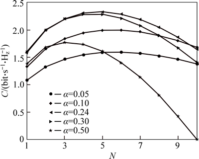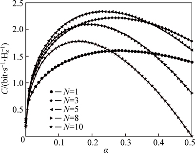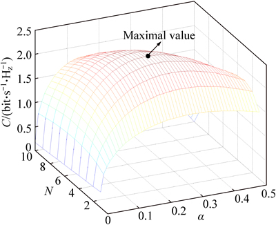 To improve the spectrum efficiency, we set Substituting Eqs. (12) and (17) into Eq. (22) and letting t=T and w=αW, C is a function of α, N and Pd as follows: