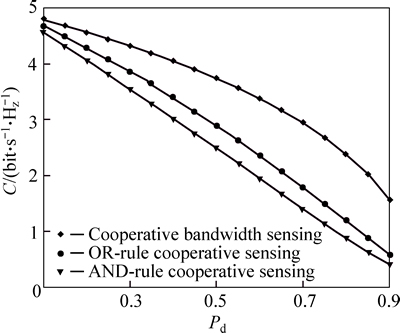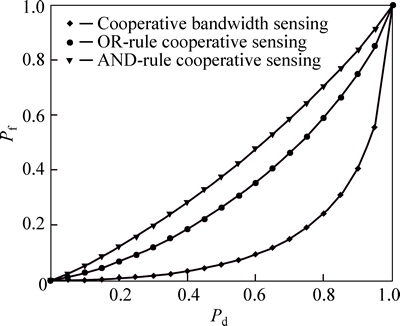 In simulations, we assume that the frame time T=5 s, the channel bandwidth W=1 MHz, the reporting bandwidth △W=0.05 MHz, the sampling frequency fs= 2W=2 MHz, the transfer rates u0=u1=0.5, the channel gains from PU to SU and SU to fusion center obey the Rayleigh distributions with means -20 dB and -10 dB, respectively, the PU’s power 10 dB·mW, the noise power