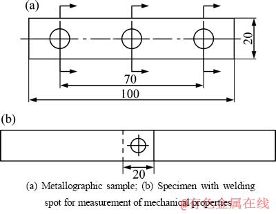 使用DZ-3×63型三相次级整流式点焊机进行焊接,试件尺寸为100 mm×20 mm×1 mm,实验焊接参数如表2所列。选用CdCu合金的球面电极,其尺寸为d 20 mm,球面半径分别为100、75、50和25 mm。采用酸洗工艺清理试件,并在12 h之内完成试验。每组实验均制备3个金相试样和3个力学性能试样,如图2所示。