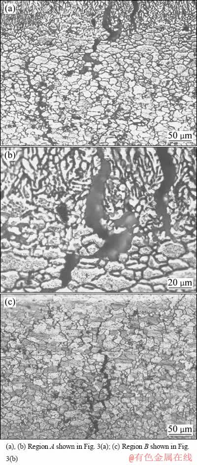 图5所示为图3中A区和B区的局部高倍光镜照片。从图5可以看出,不论是产生于熔核内的结晶裂纹还是产生于熔核周围热影响区的液化裂纹,均是沿晶界发生开裂,并沿着晶界扩展。