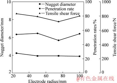 Fig. 7 Influence of electrode radius on nugget size and tensile shear force