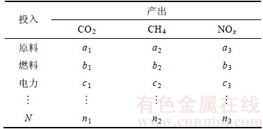 铅冶炼系统各工序中物质、元素的质量是守恒的,在各工序内运用I-O法分析工序内单位产品产生的温室气体(CO2、CH4和NOx),计算铅冶炼系统整个生命周期内的碳足迹。根据如图2所示的投入产出模型和表1所示的各工序投入和产出,可得到下列变量矩阵形式。