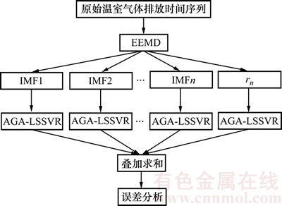 传统方法的温室气体监测都是通过工作人员对仪器设备仪表进行定期检测,这样不利于对实际生产中排放的温室气体进行监控。通过研究碳足迹预测可以把握温室气体排放趋势,对于指导实际生产具有重要意义。铅冶炼系统温室气体排放时间序列具有非稳态性、非线性的特性,只采用一般的预测方法难以取得较高的预测精度。基于EEMD降低时间序列非稳态性的优势以及LSSVR模型预测非线性系统的良好性能,本文建立一个基于EEMD-LSSVR组合的模型,以预测铅冶炼系统温室气体排放,其建模流程如图3所示。