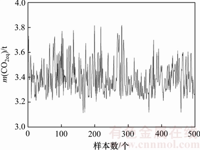 图4所示为企业A在一段时间内通过实际污染物排放测试设备(包括Horiba MEXA-720 和HoribaMEXA-554JU)测出的铅生产过程的碳足迹时间序列,可以看出碳足迹时间序列的不稳定性,它主要是铅冶炼原料成分不同、生产过程不稳定性、系统非线性等因素所致。