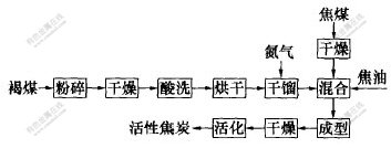 褐煤基吸附催化剂的制造分为3步:首先,将褐煤干馏制成半焦;然后,用半焦、焦煤和粘结剂焦油混合成型,并活化制成活性焦炭;最后,利用催化剂处理活性焦炭,得到褐煤基吸附催化剂。活性焦炭制备工艺流程如图1所示。