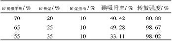 由表1可知,当原料褐煤半焦、焦煤和煤焦油的质量比为65∶25∶10时,所制备的活性焦炭的碘吸附率及转鼓强度最高。