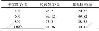 干馏温度对活性焦炭的性能影响很大。分别在400,600,800以及1000℃将褐煤干馏,然后在900 ℃用水蒸气活化,实验结果如表2所示。