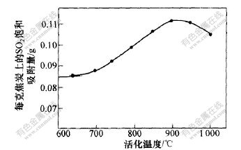 据文献[4]报道:活化温度越高,活性焦炭的微孔容积越大;活化温度越低,过渡孔和大孔的容积越大。由于需要制备用于气体吸附的吸附剂即烟气脱硫的吸附剂,故希望吸附剂的细孔越多越好。陈先明等通过实验发现[5], 活性炭吸附剂对烟气中SO2的吸附能力,当其表面上的碱性氧化物数量越多时越大,酸性氧化物数量越多时越小。另外,研究结果表明[6]:在300~800 ℃时生成酸性氧化物,而在800~1000 ℃时,则生成碱性氧化物。因此,在实验过程中,选择800~1000℃为活化温度,并在600~1000 ℃范围内考察了活化温度对活性焦炭吸附性能的影响,实验结果如图2所示。由图2可见:在低温区域,即600~800 ℃范围内,活性焦炭对SO2的吸附量较小;在高温区域,即800~1000 ℃范围内,尤其在850~950 ℃,活性焦炭对SO2的吸附量较大。因此,活化温度以850~950 ℃为宜。