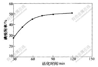 图3所示为活化时间对活性焦炭吸附性能的影响。可见,随着活化时间的延长,碘吸附率增大,但经60~90 min活化与120 min活化的活性焦炭的碘吸附率相差不大,同时考虑吸附剂在实际烟气脱硫中,由于烟道气同样会对其起到活化作用,因此,在制备吸附剂时不完全活化,需利用烟气对其再进行完全活化,以降低其生产成本。故采用活化时间为60~90 min。