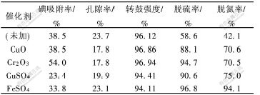 活性焦炭具有活性炭的性质,即可以作吸附剂,也可以作催化剂,还可以作催化剂载体[7],但活性焦炭本身催化活性并不强。利用活性焦炭作为催化剂载体,在活性焦炭上担载某种催化剂,制成催化活性更高的催化剂,即具有较高脱硫脱氮性能的褐煤基吸附催化剂。根据文献[8-11],先后选用了KI,CuO,MnO2,Cr2O3,Fe2 (SO4)3,FeSO4,CuSO4,MnSO4,Fe2O3和V2O5催化剂处理活性焦炭。经实验对比,最后筛选出脱硫与脱氮性能均较好的催化剂有:CuO,Cr2O3,FeSO4和CuSO4。其中CuO和Cr2O3采用混合法加入[12],FeSO4和CuSO4采用浸渍法加入[12],即分别用FeSO4和CuSO4饱和溶液浸泡活性焦炭2 h后烘干,得到褐煤基吸附催化剂。表3所示为褐煤基吸附催化剂的性能测试结果。