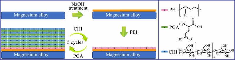 The PEMs were prepared using a dip-coating method. Layers were generated in the following sequence: “ABCBCBCBCBC”. Solutions A and B contained the cationic polyethyleneimine (PEI) (5 g/L, pH 9.0, relative molecular mass 600, 99.0%) and the anionic PGA (3 g/L, pH 6.2). And solutions C contained the cationic CHI (3 g/L, pH 5.0, 99%) and acetic acid (1%, volume fraction). The substrate was dipped into solution A for 30 min, and solution B and solution C for 5 min. Five cycles were performed during the deposition experiment to obtain (CHI/PGA)5/AZ31 samples. The preparation process and the chemical structures of the PEI, PGA, and CHI were schematically illustrated in Fig. 1.