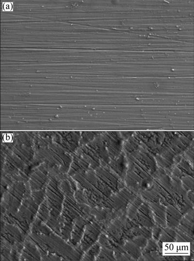 Figure 2 shows the SEM morphologies of the NaOH-treated AZ31 and (CHI/PGA)5/AZ31 coatings. The pristine Mg alloy displays visible scratches (Fig. 2(a)), which are attributed to the grinding process. While for the (CHI/PGA)5/AZ31 coating (Fig. 2(b)), the rough surface with deepening scratches implies the combination of dissolution of Mg and deposition of a thinner film.