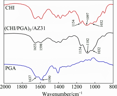 FT-IR was utilized to analyze the chemical composition of the (CHI/PGA)5/AZ31 surface (Fig. 3). For a comparison, the FT-IR spectra of pure PGA and CHI were also measured. And the spectra of the CHI/PGA multilayers feature similar characteristic peaks to those of their parent polymers. For the spectra of the (CHI/PGA)5, the characteristic saccharide peaks of CHI in the 960-1180 cm-1 region were observed: the C—O stretching absorption band at 1097 and 1032 cm-1 and the C—O—C asymmetric stretching vibrations at -1154 cm-1 [27]. On the other hand, the peaks of amide I and II groups of PGA are located at 1637 and 1590 cm-1, respectively. And in the assembled films, higher frequency shifts of amide I, amide II and C—O are found, ascribed to the strong electrostatic interaction between the —COOH of PGA and the —NH2 of CHI [28]. Thus, the results of FTIR analysis clearly prove the successful fabrication of the (CHI/PGA)5 multilayers.