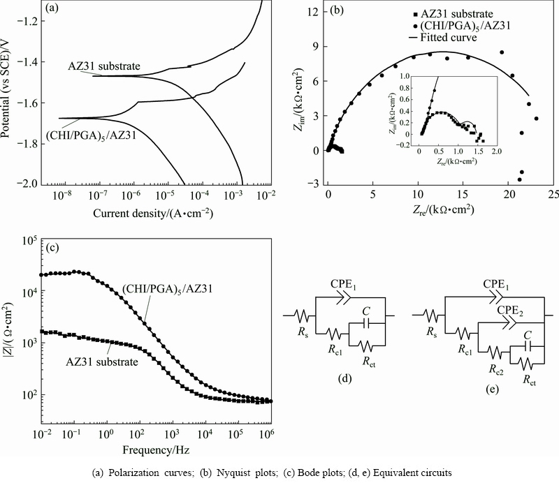 Figure 4(a) shows the polarization curves using Tafel extrapolation. The corrosion potential (φcorr) shifts to a more negative value from -1.47 V (vs SCE) of the substrate to -1.67 V (vs SCE) of the multilayer surface, which is ascribed to the formation of the hydroxide film after immersion of the alloy samples in the NaOH solution. Accordingly, the corrosion current density (Jcorr) of the (CHI/PGA)5/AZ31 coating surfaces is 4.04×10-7 A/cm2, which decreases by more than one order of magnitude compared to that of the substrate (6.85×10-6 A/cm2). The decreased Jcorr reveals that the (CHI/PGA)5/ AZ31 coating improves the corrosion resistance of AZ31 alloy. Figure 4(b) shows the Nyquist plots for the EIS studies. Two capacitive loops were observed for the plots of both the substrate and (CHI/PGA)5/AZ31 sample. It is well known that the capacitive loop in the high frequency range can be attributed to the charge transfer reaction and the diameter of the loop is proportional to the value of the transfer resistance. The larger value the transfer resistance has, the better the corrosion resistance is. The diameter (8.32 kΩ) of the loop for the (CHI/PGA)5/AZ31 is more than 20 times larger than that (0.38 kΩ) of the substrate, indicating an increase in corrosion resistance of the (CHI/PGA)5/AZ31 coating. Moreover, the low-frequency impedance modulus |Z| is one of the parameters used to evaluate the corrosion resistance of different samples in Bode plots [29,30] (Fig. 4(c)). A larger |Z| indicates a better corrosion protection performance. It can be observed that the |Z| increases with surface modification on the AZ31 substrate, indicating the beneficial effect of the multilayer in improving the corrosion resistance of the Mg alloy. The results are in agreement with the polarization curves.