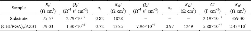 These experimental data can be accurately fitted to the equivalent circuit Rs(Q1(Rc1(CRct))) and Rs(Q1(Rc1(Q2(Rc2(CRct))))) (Figs. 4(d) and (e)) [3,15]. In these models, Rs represents the solution resistance between the reference and working electrodes, Rct is the charge transfer resistance relating to the electrochemical reaction, and Rc is the coating resistance paralleled with a constant phase element (CPE). Based on the proposed equivalent circuit models and the properties of the coating, EIS curves are best fitted, and the corresponding values of the equivalent circuit parameters are listed in Table 1. Generally, a higher Rct value implies a lower dissolution rate. The lower Rct of the Mg substrate (approximately 0.36 kΩ) suggests a high corrosion rate. The increased value of Rct (approximately 24.27 kΩ) for the LbL-assembled films emphasizes the beneficial effect of the (CHI/PGA)5/AZ31 coating.