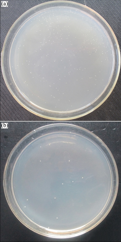 Fig. 5 Comparison of antibacterial effect of substrate (a) and (CHI/PGA)5/AZ31 sample (b) evaluated by plate-counting method