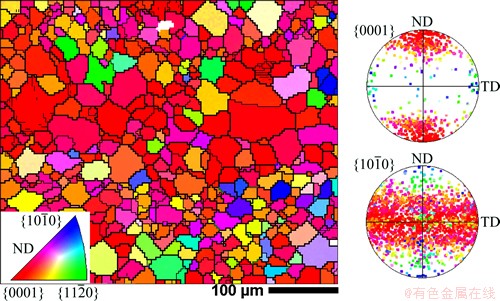 Fig. 1 Initial texture of AZ31 magnesium alloy rolled plate, and EBSD maps in ND-TD plane