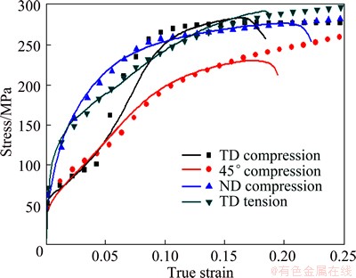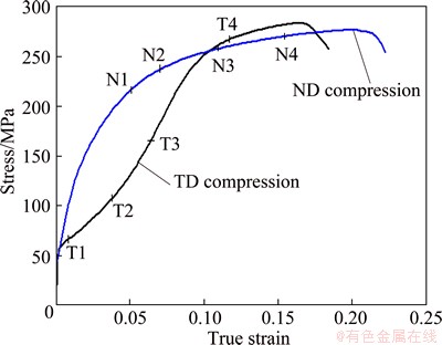 6) At high strain, although the fractions of compression twins are similar, the experimental and simulated flow stress during ND compression is lower than that during TD compression.