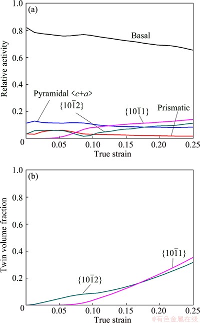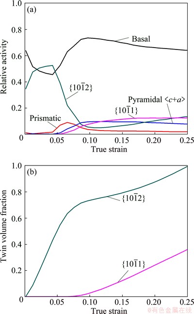 Fig. 8 Simulated relative slip and twin systems activity (a) and twin volume fraction (b) during ND compression