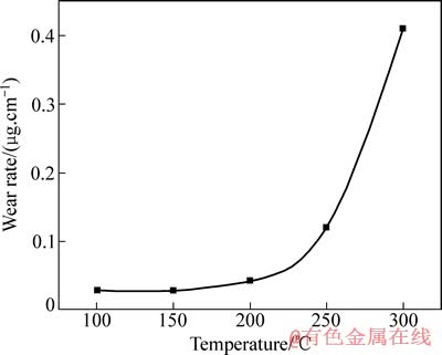 采用美国CETR公司生产的UMT-2型球-盘式摩擦磨损实验装置进行高温干滑动摩擦磨损实验。复合材料试样尺寸为20 mm×20 mm×2.5 mm,对磨材料采用d 9.38 mm的Al2O3陶瓷球。实验条件如下:滑动速度150 r/min,载荷为6 N,相对滑动时间为30 min,环境温度分别为100、150、200、250和300 ℃。实验前,每个试样磨损表面均采用金相砂纸研磨到1000号,使它们具有相同的表面粗糙度。磨损实验前后,将试样浸入酒精溶液,经超声波清洗,感量为0.1 mg的分析天平检测磨损质量损失,并除以滑动距离以转换为磨损率;摩擦因数由与磨损实验机相连的计算机上的数据采集系统采集而得。采用SEM观察磨损表面及磨屑形貌,通过EDS检测相应区域的成分,用奥林巴斯激光共焦扫描显微镜OLS4000分析磨痕的粗糙度。