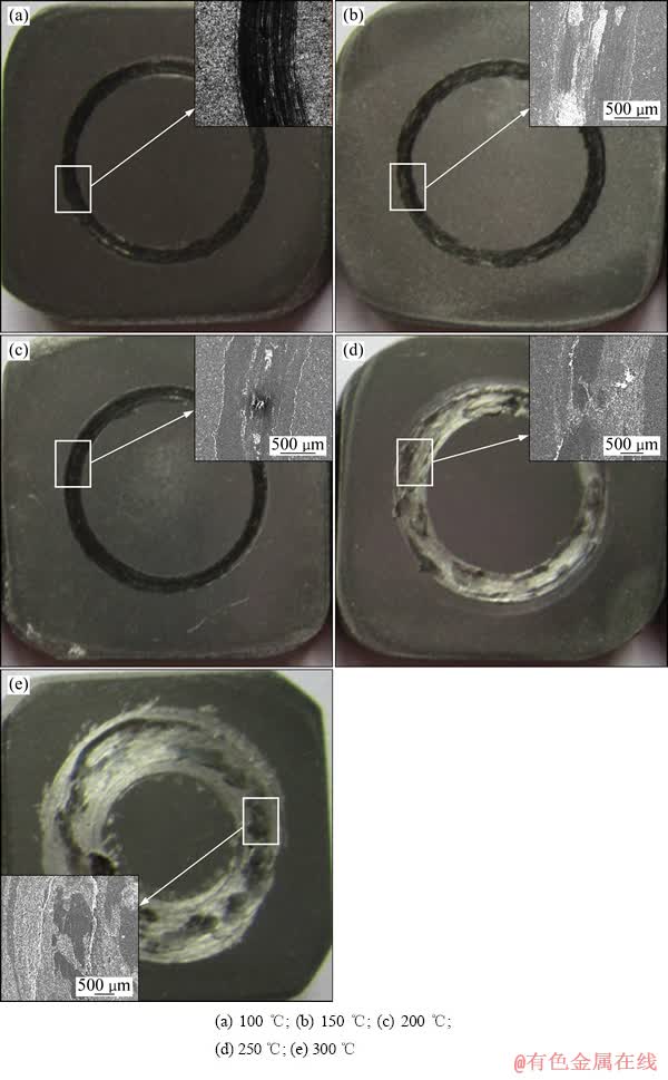 SiCp/A356复合材料在常温下的滑动摩擦磨损的研究表明,通常多种磨损机制同时存在并对材料的摩擦磨损性能产生影响[15]。从图1的结果看,高温下滑动摩擦磨损过程,也同时存在不同的磨损机制。图3所示为SiCp/A356复合材料在不同温度下经滑动摩擦磨损实验后的磨损面的宏观形貌。从图3中可以看出,在200 ℃以下,磨痕浅且细(见图3(a)~(c)),表面光滑平整呈黑色,宏观上表现出磨损率很小(见图1)。表面的黑色表明,复合材料发生氧化,而此时磨屑很少且极细,因此可以初步推断此时主要发生氧化磨损。试样及环境温度提高到250 ℃以上时,由于温度升高使复合材料强度和硬度降低,磨损表面出现严重的塑性变形层,同时大量的磨屑粘附在摩擦轨迹不同位置,且出现堆积现象,导致表面粗糙不平,磨痕大且深呈银白色(见图3(d)~(e)),因此,出现图1所示的磨损率线性增加的现象,从中大致可以判断为出现严重的粘着磨损。