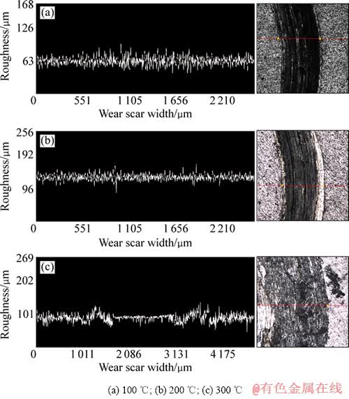 图4所示为通过OLS4000型奥林巴斯激光共焦扫描显微镜检测的不同温度下磨痕的粗糙度曲线及粗糙度测量位置。由图4可见,随着温度的升高,磨痕的粗糙度逐渐增大,由7.015 μm增大到12.035 μm(考虑到此时磨痕表面不平整,存在堆积层,此值为检测5个部位的平均值)。温度低于200 ℃时,粗糙度值变化很小(仅增加9.4%),表明此时磨损率的增加较小;而实验温度从200 ℃增加到300 ℃时,磨痕粗糙度值变化很大(增加92.5%),表明此时温度的增加带来磨损率的急剧增加,与图1的实验结果相吻合。这种摩擦磨损过程中磨痕粗糙度的变化将对制动盘的性能带来较大影响。磨损表面的粗糙度不仅影响材料的疲劳强度,还影响其耐磨性,因为随着磨损的进行,磨痕面粗糙度增大,其表面变的不平整,导致复合材料和对偶材料的有效接触面积减小,磨痕表面所受到的压力增大,滑动要克服的障碍增多,从而使摩擦因数增大,同时,磨损加快,材料损耗加速,最终可能导致制动盘使用寿命缩短。