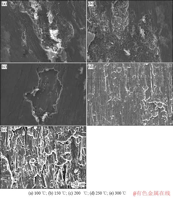 随着温度的升高,材料的表面受到了不同程度的破坏。图5所示为材料在不同温度下磨损后的磨痕面形貌。由图5可见,对应图1的轻微磨损的温度部分的磨痕(200 ℃以下),其磨损面形态基本一致,磨损面除了较浅的犁沟外还有磨屑脱落后留下的凹坑(见图5(a)和(b))。这是由于在磨损过程中,材料表面的SiC颗粒在Al2O3陶瓷球和旋转力矩的切削作用下,产生塑性变形,在局部产生大量热量,使复合材料发生部分氧化,SiC颗粒破碎并从材料表面脱落形成磨屑,导致磨损面上出现凹坑。200 ℃时的磨损面塑性变形痕迹开始比较明显,并出现剥离痕迹(见图5(c)),剥离部分存在明显的犁沟,这是由于在磨损初期,从材料表面脱落的SiC颗粒而形成的磨屑附在Al2O3陶瓷球接触表面,形成三体磨损,犁削材料表面而成;进入磨损中期,复合材料表面开始产生细粉状磨屑经过反复地切削磨损作用,破碎为更细小的颗粒,并被碾压平铺于磨痕表面,随着磨损进行,部分被碾压堆积的磨屑剥落。250 ℃以上的磨损面形态类似,但磨损程度不同。相对于在250 ℃时的磨损面(见图5(d)),300 ℃的磨损面更粗糙,塑性流动更加严重,且形成明显的波浪纹(见图5(e))。原因是在高温磨损载荷作用下,磨损形成的磨屑由于高温影响在新的表面产生粘着、焊合,随后又被切断、转移,使磨损表面形成犁沟,产生较大的塑性变形,产生大量块状磨屑。同时,大量磨屑从磨损试样转移到Al2O3陶瓷球表面粘附,使得对偶材料表面被复合材料所覆盖,磨损材料不能与其直接接触,这样摩擦磨损在同种材料之间发生。由于高温作用使铝合金的塑性增加,摩擦因数增加,同时极易造成试样与对偶件(表层粘附着磨屑)的粘合,磨损量也大幅度增加,形成大量块状的磨屑。此阶段以粘着磨损机制为主。