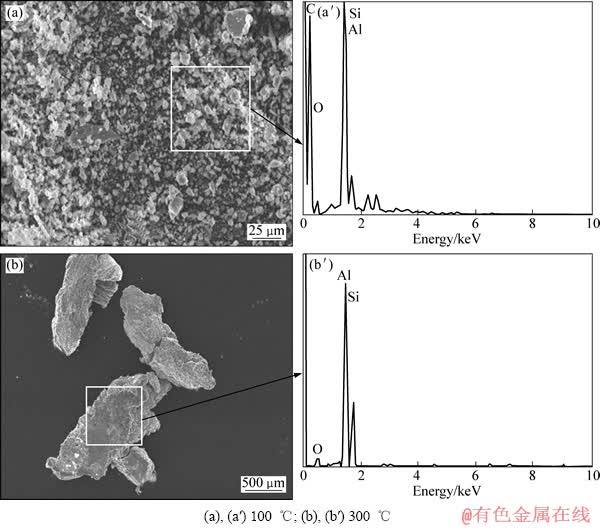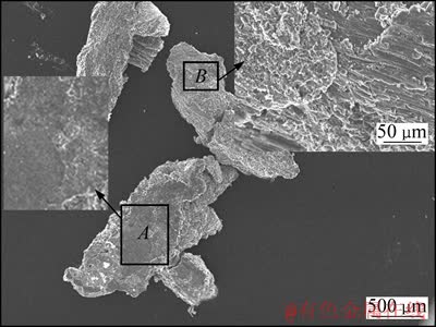 摩擦磨损过程中磨屑是摩擦副双方相互作用的结果,因此,磨屑的形貌,尺寸、数量及化学成分的变化可以反映出磨损率的大小及摩擦磨损机制。因此,通过对磨屑的分析,可以在一定程度上分析出磨损的机制。图6所示为复合材料在不同温度条件下磨损后的磨屑形貌及局部区域能谱分析图。通过摩擦磨损过程中产生的磨屑形成过程、宏观形貌及图6所示的SEM观察发现,磨屑主要有两种形态:一是在较低温度时,在图1所示的轻微磨损过程中产生的磨屑,它宏观上呈现非常细小的粉末状;二是随着温度升高,进入严重磨损阶段时产生的磨屑,宏观上呈银白色的粗大的块状,也存在一些比较小的磨屑,但它们所占体积分数甚小。100 ℃温度下形成的黑色细小磨屑尺寸在10 μm以下。由图6(a)的能谱分析结果可知,除了Al、Si外存在较多的O,这部分O来自摩擦磨损过程中表面氧化形成的Al2O3,表明这个阶段的磨损以氧化磨损为主,相同材料在常温下的干滑动摩擦磨损研究中,采用与本实验相近的载荷下,同样形成细小黑色磨屑,分析结果为氧化磨损为主的磨损过程[16],本实验从磨损面及磨屑的分析中可得出相同的结论。300 ℃温度下形成的磨屑,其形状为块状,尺寸约400~1 000 μm(见图6(b))。这些大尺寸的块状磨屑表面也明显呈两种不同形式,一种为表面呈黑色,比较光洁(见图7中A区),此表面为磨损初期复合材料和对偶材料相互摩擦形成的。表层局部凸起被碾压塑性变形,并表层氧化形成的。与对偶材料接触的表面,另一种表面为呈银白色,表面粗糙且存在明显塑形流动的痕迹(见图7中B区)。此面应为磨屑形成过程中磨屑和复合材料基体的撕裂面,此形状的磨屑为较为典型的粘着磨损磨屑,此阶段形成的磨屑都以大尺寸的块状磨屑为主,同时存在少量细小黑色磨屑。因此可推断,在高温下磨损以粘着磨损为主,同时存在微量的氧化磨损。
