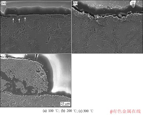 材料在摩擦磨损过程中,不仅表层遭受到一定程度的破坏,同时,由于摩擦力和旋转力矩等的作用,次表层也会受到一定程度的影响。图8所示为SiCp/A356复合材料材料在不同温度下的磨损断面形貌。由图8可见,温度为100 ℃时,复合材料出现了一定的裂纹(见图8(a)中箭头),裂纹的存在,说明材料即将开始遭到破坏脱落;当温度升高到200 ℃时,复合材料的磨损断面高低起伏不平,存在明显的磨削痕迹,还有部分SiC颗粒脱落的现象(见图8(b))。这是由于环境温度的升高,导致对磨材料之间的温度升高,基体出现变形,使得材料中的增强颗粒SiC暴露与对磨材料Al2O3陶瓷球直接接触,随着磨损过程的进行,暴露在外的SiC颗粒脱落破碎。温度进入高温区,达到300 ℃时(见图8(c)),复合材料的塑性流动痕迹非常明显,而且存在明显的SiC颗粒堆积现象。所以,随着温度的升高,材料的磨损越来严重。