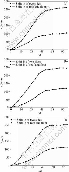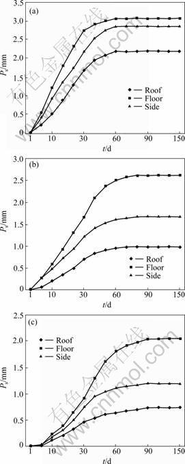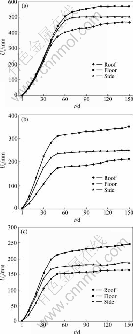 increased to the average rates of 9.78, 10.81 and 10.43 mm/d for model Ⅰ, 4.25, 7.41 and 5.59 mm/d for model Ⅱ, 3.45, 5.62 and 4.14 mm/d for model Ⅲ. The displacement decreases rapidly, and enters the second stage—steady-state creep in the 60th day for model Ⅰ, in the 50th day for model Ⅱ, in the 45th day for model Ⅲ. After 150 d, the ultimate displacements of roof, floor and side are 489.66, 566.62 and 499.58 mm for model Ⅰ, 213.17, 350.48 and 248.66 mm for model Ⅱ, 162.29, 245.15 and 186.92 mm for model Ⅲ.